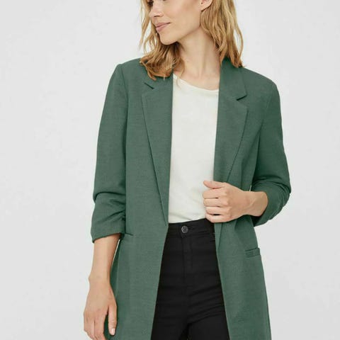 Modellen har rette linjer, skulderputer og et moderne, ĂĽpent design som gir en flatterende silhuett. Passer like fint til jeans som til kontorantrekk eller en kjole pĂĽ kvelden.
