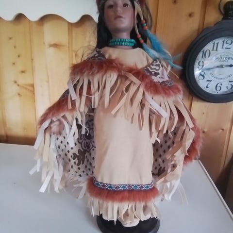 Dukke med klær inkludert rød lue, rød og grå stripete genser, grå kjole med seler, og hvite bukser. Dukken har langt flettet hår og er egnet som juledekorasjon
