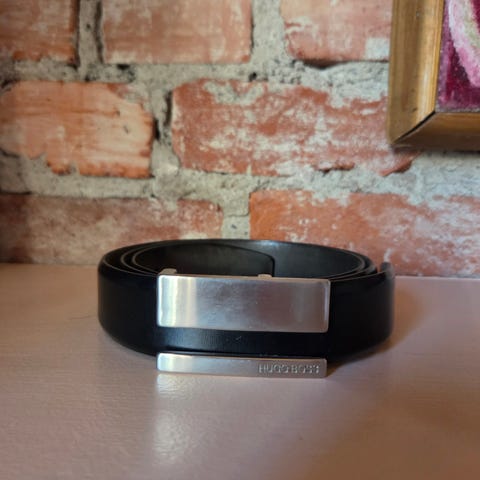 Herre belte i brun skinn med metallspenne fra Hugo Boss; justerbare hull for tilpasning og et rektangulært spenne med BOSS-logo; fin varm brun farge; ekte skinn; normal stand med fin, naturlig slitasje, ingen skader;