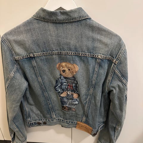 Ralph Lauren Polo genser i blå farge, størrelse S for dame. Genseren er laget av 100% bomull og er håndstrikket. Den har et dekorativt motiv av en bjørn med amerikansk flagg på brystet. Anbefalt håndvask i kaldt vann, unngå blekemidler og tørk flatt for best vedlikehold.