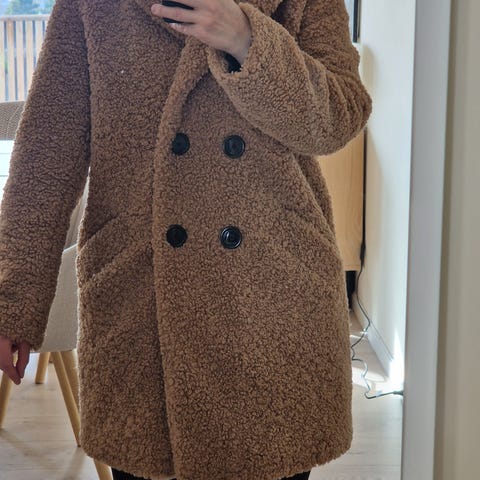 Pent brukt, nyvasket, ingen dyr, røykfri bruker 😊. Lekker kåpe i sesongens motefarge, burgunder. Vanskelig å få frem riktig farge på bildene. Fin som oversize for en small også.