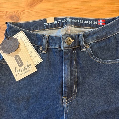 De som vet, de vet. Funaki er norsk-produserte jeans. Disse er mørke og pene i jeans-stoffet - de er merket med svart, men jeg vil si de er mørk blå. Kan brukes på jobb. De er meget lite brukt, og er et par nydelige jeans. Modellen heter Concord.