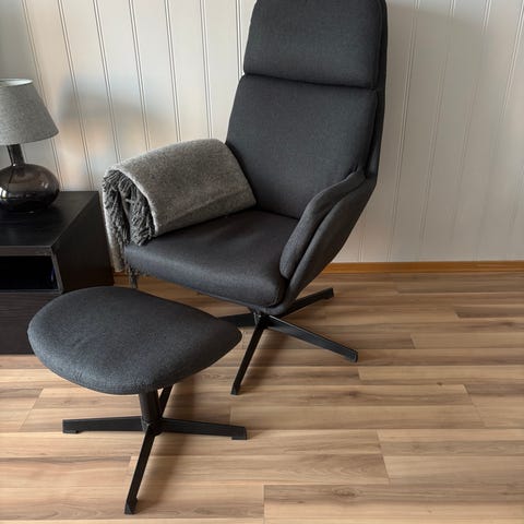To stk Driva hvilestol m/skammel kjøpt 26.06.25 i fargen Brego light brown. Impregnert og nesten ikke brukt. Selges samlet, kvittering medfølger.