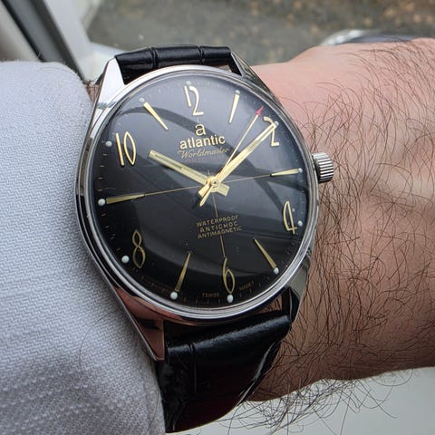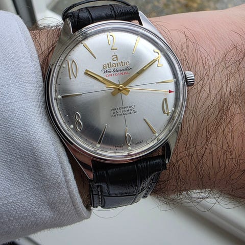 Vintage Atlantic worldmaster.Holder tiden godt, trekkes opp lett,fint i glasset, nydelig patinert urskive, original krone.