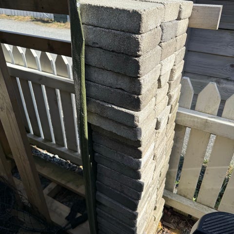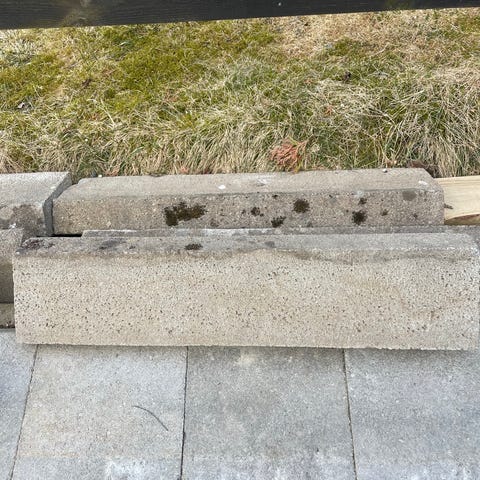 Betongstein med en lengde på 140 cm, grå farge og solid materiale. Passer til utendørs bruk som hage- eller toppstein på mur. Ca 10 stk Plus litt kapp