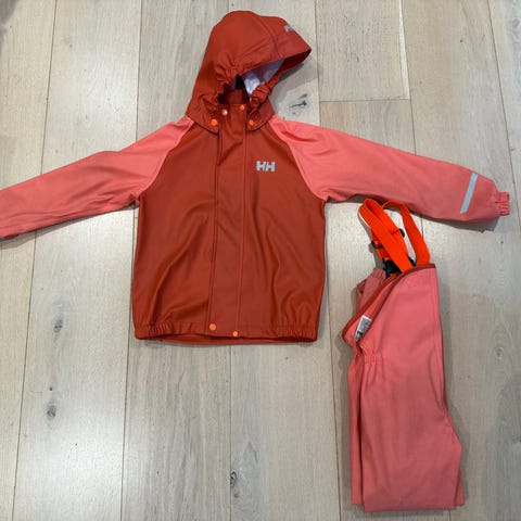 Pent brukte regnklær i strl 120-122 (6-7 år) av merket Vossatassar (jakke og bukse) og Helly Hansen (jakke). Samlet 200kr eller 75 kr/del. Sydvest strl 52-54 følger med totalpakken hvis den ikke allerede er solgt.