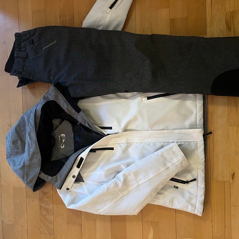 Swedemount skibukse og jakke for dame i størrelse L. Fargen er grå med rosa detaljer på jakken. Materialet er å være vannavstøtende og egnet for vinteraktiviteter som ski. Jakken har flere lommer med glidelås, og buksene har forsterkede partier ved knær og nederst på beina. Passer til bruk i kalde og våte forhold.perfekt for skitur,til snowboarding.