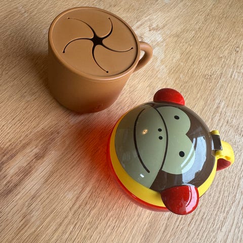Mam Barnesafe Barnesutteflaske med to håndtak, gul hette og klar flaske med blått kaninmotiv. Egnet for små barn, laget i plastmateriale.
