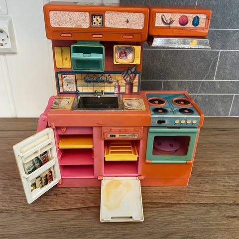 Den er litt slitt på sidene, men ser veldig bra ut på utstilling. Kan også brukes til oppbevaring av Barbie klær og acessoirer. 🎀