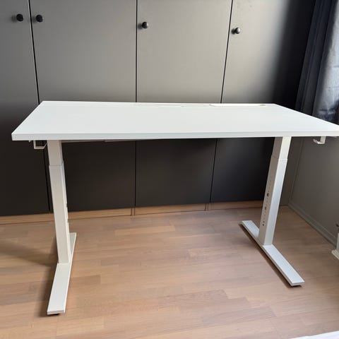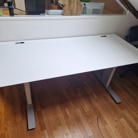 Skrivebordet er i veldig god stand. God kvalitet. bordplate 140x80cm, melamin grå. bordstativ hvit blank. Det kan justeres manuelt med en sveiv.