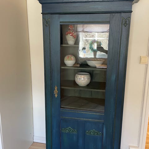 Nydelig gammelt hjørneskap. Fantastisk fin blåfarge. Hvitt på toppen og platene inni. Platene på baksiden spriker litt.