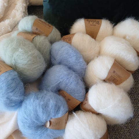 Fargekode og innfarging, samt antall nøster står på bildet.