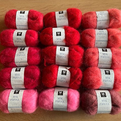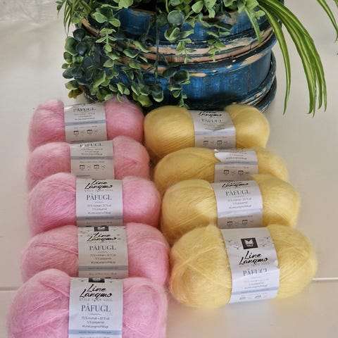 Fargekode og innfarging, samt antall nøster står på bildet.