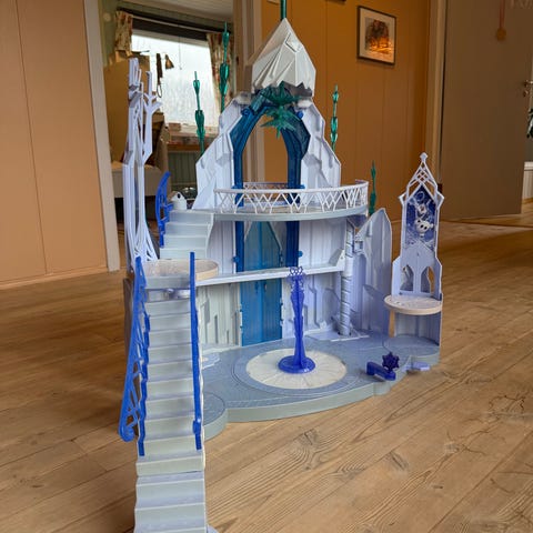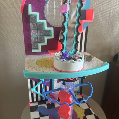 L.O.L. Surprise! Winter Chalet dukkehus med flere rom og tilbehør. Inkluderer møbler som vist på bildet. Designet i pastellfarger med vintertema. Passer for barn som liker rollespill og lek med dukker. Skiheisen funker, men som du ser av nærbildet er plasten synlig brukt. Det følger heller ikke med snøkuler. På soverommet er det klistret på klister av Stitch, som jeg ikke tar vekk mtp at det kan skade veggen.