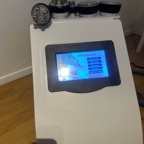 Selger Hydrafacial-maskin som fungerer helt som den skal. Utstyrt med tre separate væskebeholdere merket A, B og C for ulike behandlingstrinn. Enheten har en kompakt design med kontrollpanel og flere applikatorer for ulike hudpleiefunksjoner.