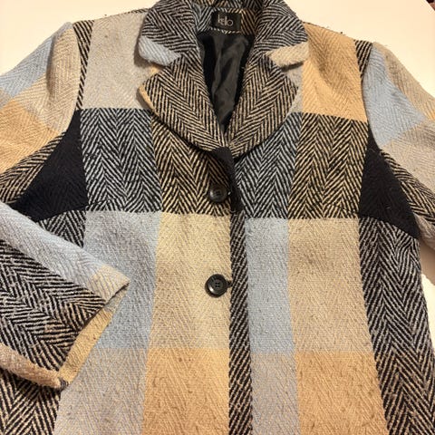 Meget pen dame dressjakke i lang fasong, lengde 95 cm. Ingen skader eller merker. Sitter fint på, litt tyngde i stoffet. Beige med silkefor.