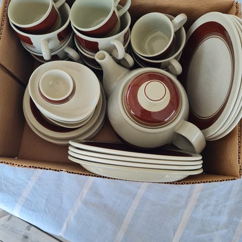 Dovre kaffeservise. 8 asjetter, 6 kopper, 8 skåler, 1 fløtemugge og 1 sukkerkopp med lokk.