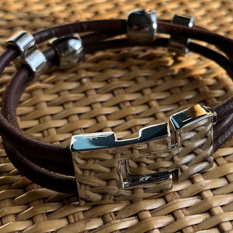 Efva Attling armbånd i 925 sølv og skinn selges for 800,- Nypris var ca 3500,- 19 cm langt.