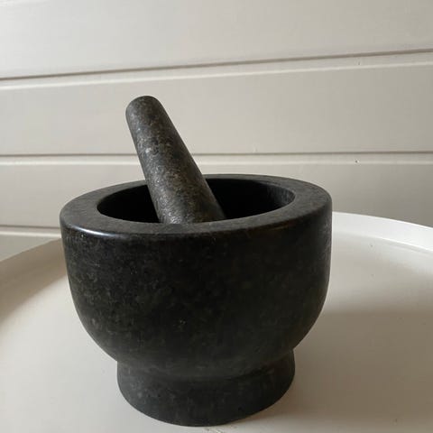 IKEA morter med treskaft, laget av grønn keramikk og tre. Morteren har en praktisk tut for enkel hellefunksjon og treskaftet fungerer som støter. Egnet for knusing og maling av krydder og urter i kjøkkenet.