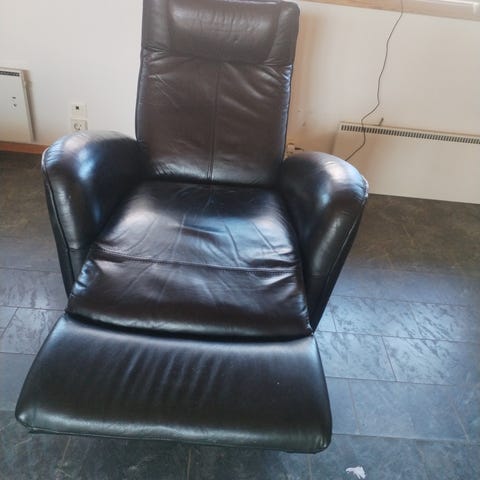 Lenestol i svart hud med mahognifarget trefot selges billig. Tror det er Ekornes, men ikke sikker. Trekket føles som skinn, men kan være skai. Godt brukt, men ingen skader i trekket, og lite slitasje. Stolen er fremdeles god å sitte i. Hentes i Ski sentrum.