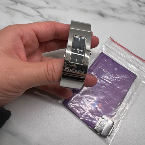 Merke: DKNY. Modell: NY-1126. Urverk: Kvarts (batteridrevet). Urkasse: Sølvfarget rustfritt stål, ca. 41–42 mm i diameter. Skive: Svart med analog visning, hvite arabiske tall og datovisning.