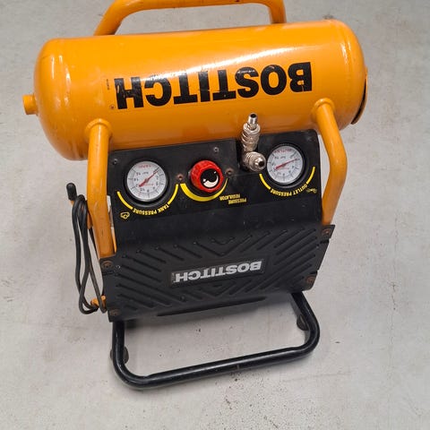 Kompressor Bostitch PS17-M, 10 bar arbeidstrykk, 17 liter trykktank. Kjøpt for 3 år siden men er ubrukt, enda ikke tatt av plastfilm beskyttelsen.