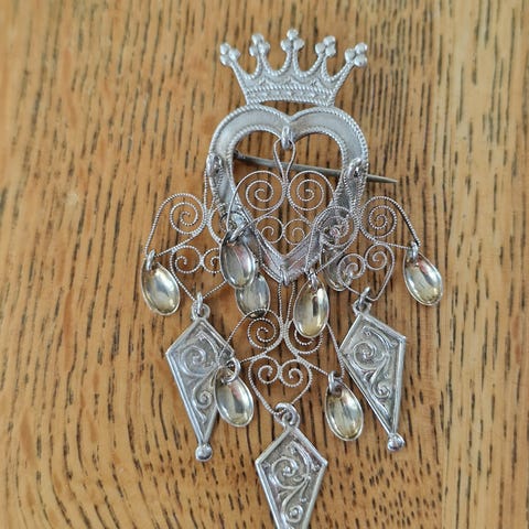 Nydelig liten kronesølje med forgylte skjold. Norsk sølv.