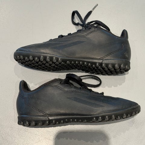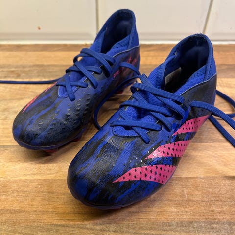 Adidas Predator futsalsko fotballsko i størrelse 32, hvit med røde detaljer og gult innerfôr. Skoene har knotter egnet for kunstgress og gressbaner. Materialet er syntetisk, designet for å gi god ballkontroll og komfort under spill.