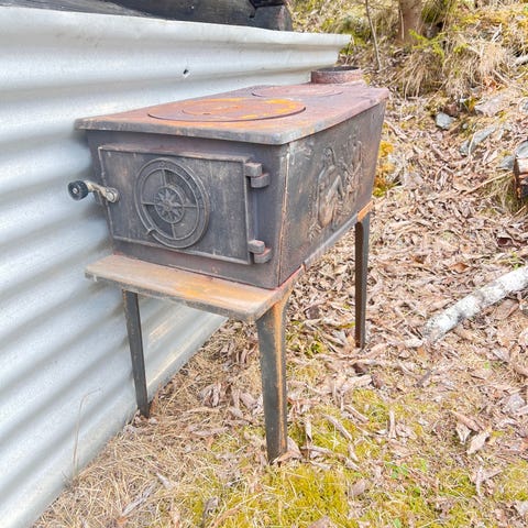 Gammel vedkomfyr laget i støpejern med flere ovnsrom og kokeplater på toppen. Kjøkkenkomfyren har dør med håndtak og termometer, justerbare ventiler for lufttilførsel, og ben for stabil plassering. Egnet for oppvarming og matlaging ved bruk av ved som brensel.