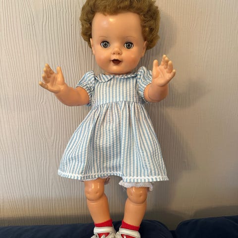 En nydelig anne dukke ca 30 cm mangler hår her og der men ellers er hun fin klær følger med se bilder for stand sender i posten bruker ikke fiks ferdig men vipps og pipen funker også på denne dukken 🙂