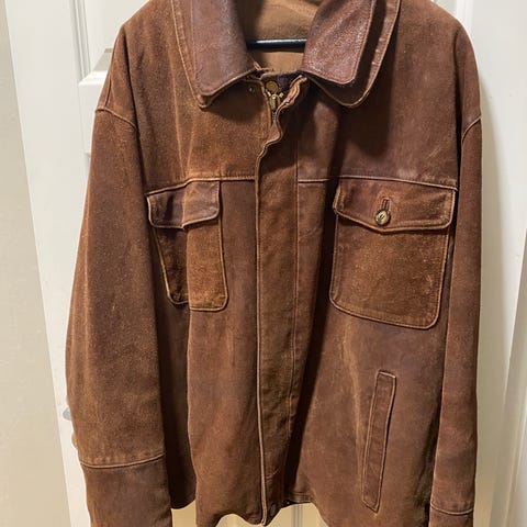 Godt brukt, men i god stand, semsket skinnjakke i herrestørrelse 48. Jakken er synlig brukt, men hel og uten noen mangler eller huller i for eller lignende. Jeg har byttet ut knappene foran. Glidelåsen på innerlommen er hel og fungerer fint. Jakken er helt rett i modellen, type herreblazer, og har en trykknapp nederst på hver side. Lommer foran med flapp over. Passer str L/XL til dame. God lengde på ermene.