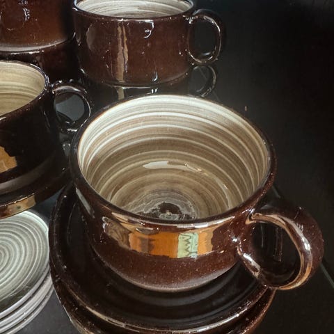 Legg til et snev av vintage-sjarm til teen eller kaffen din med disse Denby steintøykoppene, laget i England. Deres moderne stil i mid-century-stil og brune sjokoladedryppmønster gjør disse koppene til det perfekte tilskuddet til enhver samling. Laget av steintøy av høy kvalitet og hånddekorert med kunstnerisk keramikk, vil disse koppene garantert imponere. Settet inneholder fem kopper, hver omtrent 6,5 cm høye, med et unikt sjokoladedryppmønster. Baksiden av hver kopp er trykt og laget av keramikk. Disse koppene er perfekte for servering av te eller kaffe, og vil garantert imponere gjestene dine.