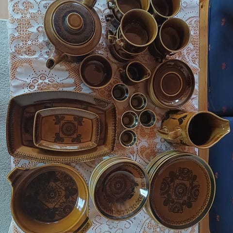 Sett med 5 Denby te- og kaffekrus og skåler.