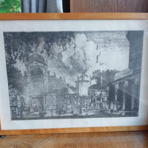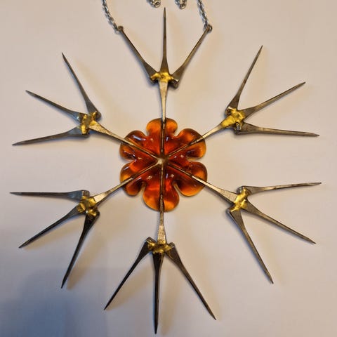 Det er en skrue nederst i figuren fordi den har hengt på en vegg. Den kan taes ut hvis ønskelig. Det er sagd av litt på den ene siden nederst der skruen er for at den skulle henge oppe på en vegg. Se foto.