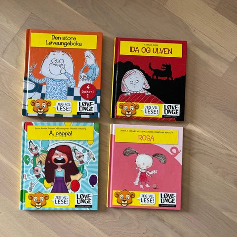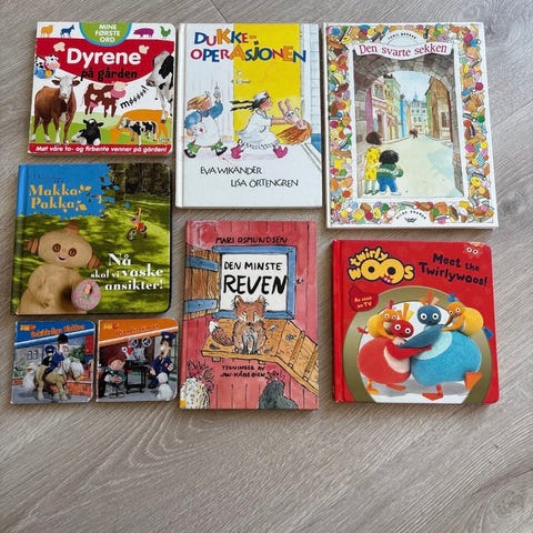 Samling av barnebøker med ulike titler og temaer, inkludert bøker om dyr, følelser og eventyr. Passer for barn og unge lesere. Bøkene har fargerike illustrasjoner og varierende format.