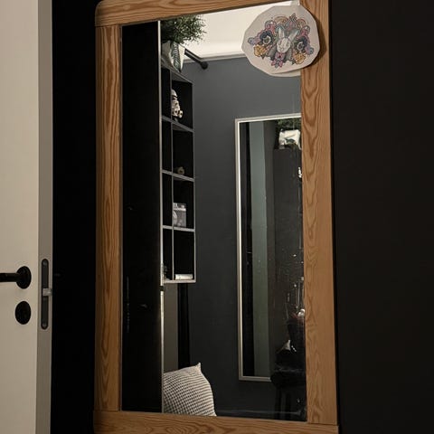 Speilet er helt og fungerer som det skal. Noen mindre bruksspor kan forekommer. Fronten er jevn og gir godt speilbilde, praktisk å ha vegghylle med speil.