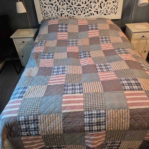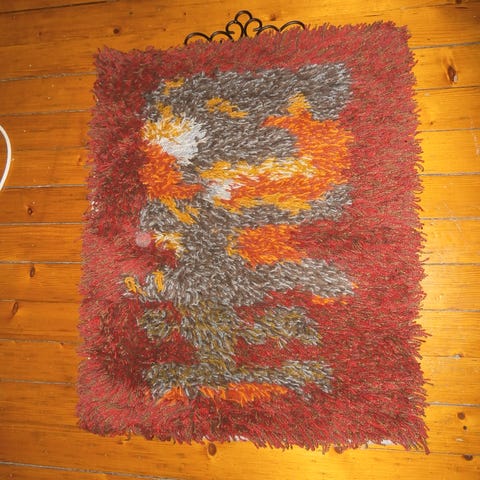 Retro, tykt fleeceteppe. Stort teppe på 129 x 194 cm. Teppet har ulikt mønster på hver side. Det er helt og pent og i god stand.