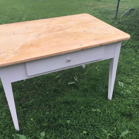 Bordplaten er ubehandlet tre med synlige kvister, og rammen er malt i rød farge. -har firkantede ben og en enkel konstruksjon. Egnet som skrivebord eller arbeidsbord. Ingen skuff .