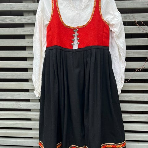 Meget pent brukt, med bluse, veske, lue, sjal, 2 søljer og sko str 40-41. Passer til person ca 170 cm. Midjemål 80 cm.