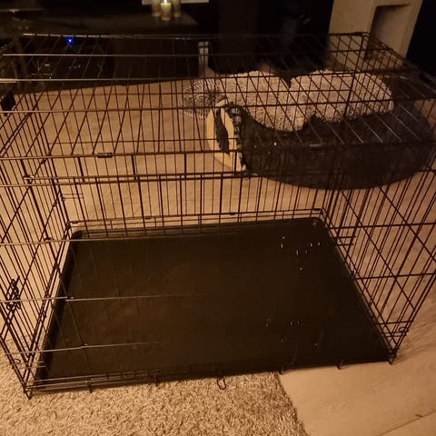 Nesten ikke brukt Metallramme hindesoveseng med dekorative buede detaljer og svart finish. Inkluderer en grå pelspute som dekker soveflaten.