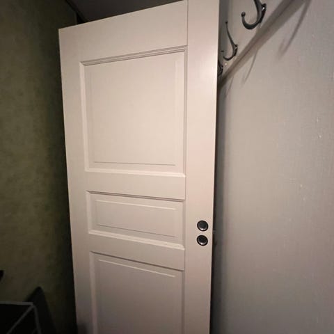 Selger 4 innvendig dør i hvit farge med klassisk paneldesign. Døren har et metall dørhåndtak med rund rosett. Passer til bruk i bolig, kontor lager som romdør. Dørblad 86 - Passer til 90x200