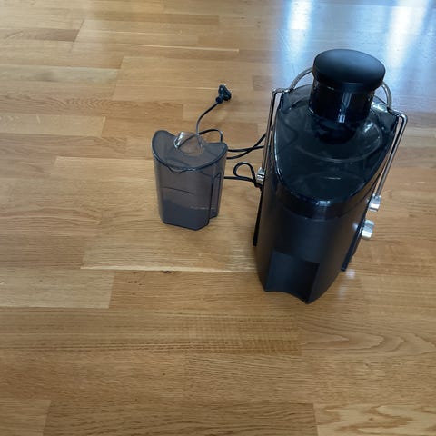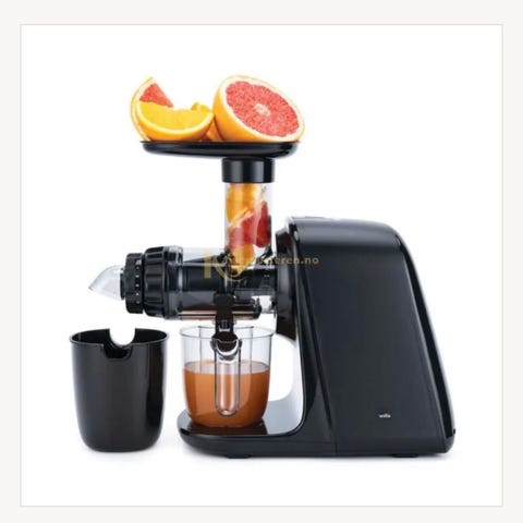 Wilfa JuiceMaster juicepresser i svart og sølv. Inkluderer flere deler for montering og rengjøring. Egnet for å presse juice fra ulike frukter og grønnsaker.