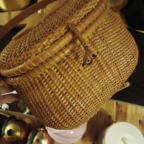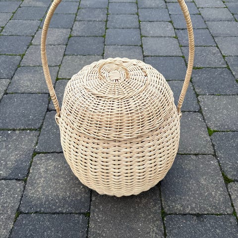 Vintage håndflettet kurv. I meget god stand,en liten skade inni,se bilde. Fin til garn,juledekorasjon,til påskeegg...eller hva man lyster. Måler på det lengste 43cm, bredeste 34cm, høyeste med lokk ca 20cm.