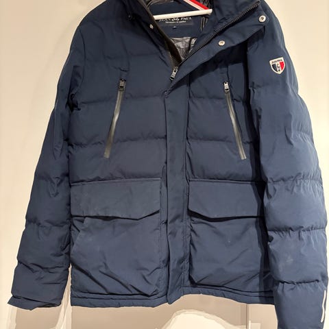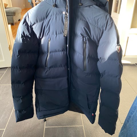 Jean Paul Jakke i størrelse XXL, blå farge, type Grant. Jakken er designet for menn og egnet som yttertøy. Materialet består av 100% polyester med fyll av dun og fjær, som gir isolasjon og varme. Jakken har hette, frontlommer med klaff og glidelås, samt knapper. Den er egnet for utendørs bruk i kaldt vær. Ikke brukt.