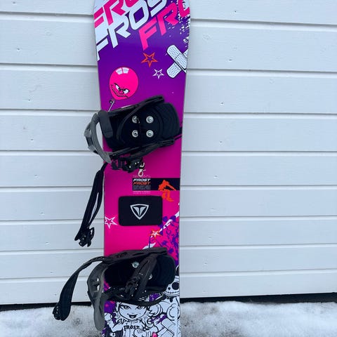 Populært Frost snowboard med blå og hvit grafikk, inkludert motiv av isbjørn. Brettet er designet for vintersport og har detaljer som advarselstekst og grafiske elementer. Uten bindinger. Obs: noe slitt i kantene - må nok slipes og sikkert vokses under.