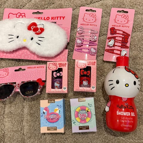 Hello Kitty barneleketøy tilbehør sett med flere småting som vesker, hårbånd, og klær i ulike farger og materialer. Passer for barn som liker Hello Kitty-tema. Bluse lende 8 cm bredde 11 cm ( rund 22 cm) stakk Lende 7 cm bredde 13 cm liv 9 cm.