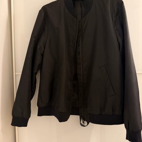 Klassisk svart farge, glidelås foran, ribbestrikket krage, samt skrålommer i front. Bak