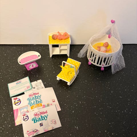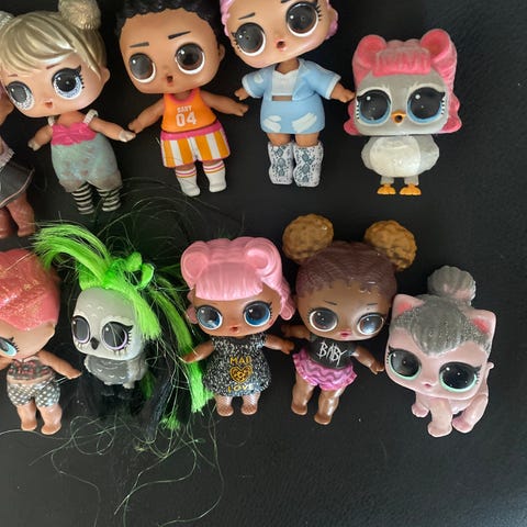 L.O.L. Surprise dukke med tilbehør inkludert barnestol, kosedyr, matboks, flasker, smokker, hårbørste, og andre småting. Passer for barn som leker med dukker og tilbehør.