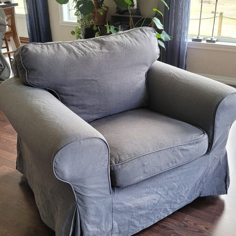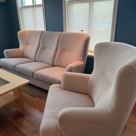 Sofa og to lenestoler med komfortabel dunpolstring. Det er avrundede armlener og hjul på fremre føtter.