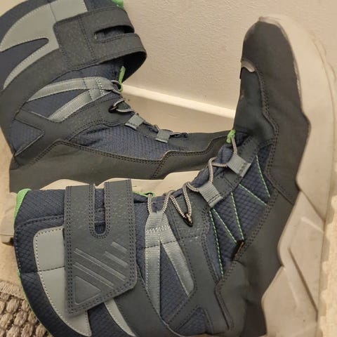 Superfit barn vinterstøvler i størrelse 40, designet for gutter. Støvlene er svarte med blå og gule detaljer, laget av vanntett materiale egnet for kalde og våte forhold. De har borrelåslukking for enkel på- og avkledning, samt godt grep under sålen for stabilitet.